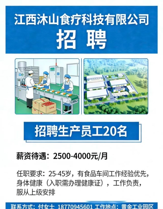 企业名称:江西沐山食疗科技有限公司招聘岗位:普工人数:20名年龄要求:25...