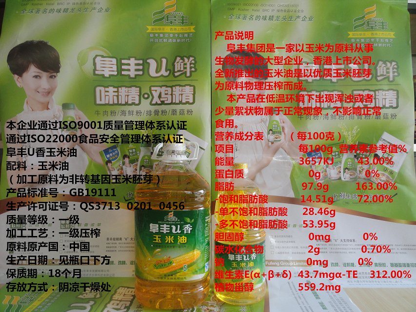 阜丰u香5升玉米油现在疯狂促销中,凡是在本店购买阜丰u香5升玉米油一件的(一件四瓶)都送价值58元礼品(礼品包含双料不锈钢脸盆一个<价值28元>、阜丰u鲜味精一袋908克<价值13元>、阜丰围裙一条<价值11元>),并加送赠品卷一张(阜丰u鲜200克鸡精一袋<价值6元>),活动时间2014年7月6日至7月31日,买到就是挣到,市场价80元一瓶,买一瓶没有礼品,但是买一件就有礼品相送,想想多么划算,全国只有阜丰公司生产的玉米油通过ISO9001质量认证,ISO22000食品安全认证,其他任何不管玉米油、花生油、菜籽油、大豆油还是其它什么油都没有的,所以买阜丰玉米油和阜丰u鲜味精、阜丰u鲜鸡精、都是健康食品,为了您和家人的健康请选择好的产品!