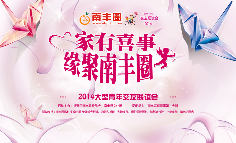 2014年 家有喜事 缘聚南丰圈 大型青年交友联谊会 活动主题:家有喜事 缘聚南丰圈 活动通知: 为切实服务全县广大青年的交友联谊需求,进一步丰富青年的业余文化生活,并以此为切入点有效增强青年分类引导工作的针对性和实效性,进一步推动“两新组织”团建工作,团县委决定在全县范围内组织开展“家有喜事·缘聚南丰圈”大型青年交友联谊会。现将有关事项通知如下: 活动意义 活动旨在紧紧围绕社会主义核心价值体系建设,主动为全县单身青年交友联谊打造一个诚信、健康、文明的互动平台,引导广大单身男女青年树立正确的价值观和交友婚恋观,鼓励青年立足岗位、无私奉献,以更好的精神风貌积极投身“打造三宜一中心、建设幸福新桔都”的生动实践。让青年展示自我的风采,增进彼此的了解,结识志趣相投的知音,寻觅相濡以沫的伴侣,收获美好幸福的爱情 活动时间:2014年8月1日(周五)19:00-22:00 入场时间:18:00—19:00 活动地点:南丰县国安大酒店一楼宴会厅 参加人群:机关、企事业单位干部,中小学教师,医院医护人员,企业高级管理人员等单身人士(21岁—45岁) 报名时间:7月28日之前请携带好本人身份证至报名点报名 报名地点:(1)团南丰县委(县行政大厦六楼团县委办公室 联系电话:0794-3226088 QQ:28644631 (2)家有喜事婚礼会所(南丰县医保局旁,即桔都广场斜对面国际花园高层楼下) 联系电话:18907041985 活动报名费:免费(用于相亲牌、报名、奖品设置等) 主办方:共青团南丰县委员会、南丰县文化局 承办方:南丰家有喜事婚礼会所 赞助商:美好时光影城、凉茶和其正、名流商行、纽约国际摄影、桔都旅行社、小华商行、御膳坊酒店 媒体支持:南方网络科技 南丰圈 温馨提示:此次交友联谊会为广大单身青年朋友提供的是一个交友联谊的公益平台,参与的嘉宾必须对自己的一切行为负责。活动方希望参与的各位嘉宾在征友、应征、约见或婚恋过程中保持足够的辨别能力,免受不法侵害和财产损失,所发生的任何纠纷,活动方不承担任何责任。
