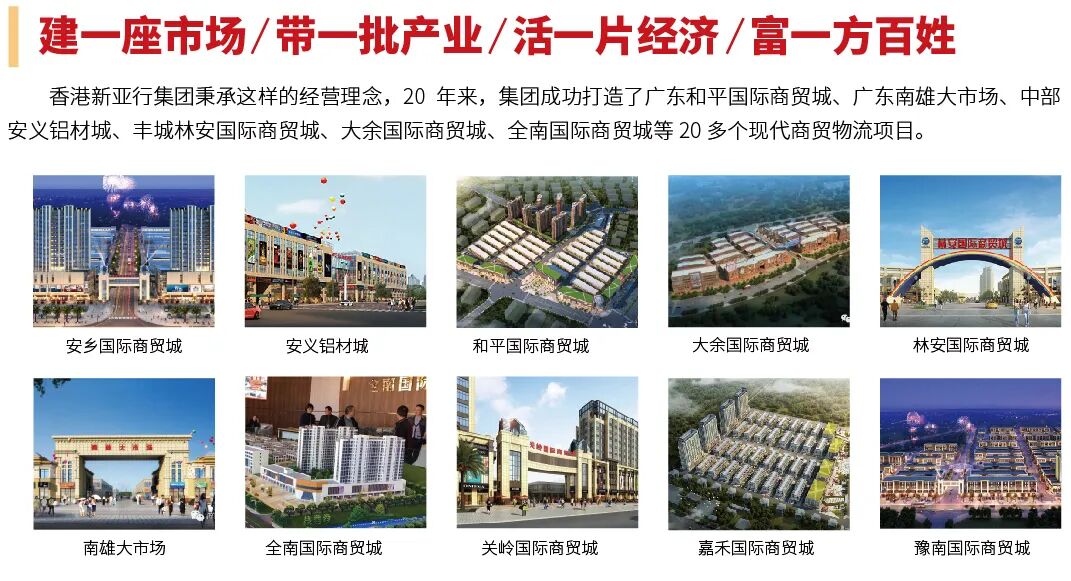 南丰国际商贸城,县政府扶持,携手中国商贸流通开发运营专业——香港新亚行集团,打造南丰一站式商贸综合体,囊括家居建材、五金机电、汽贸汽配、装饰石材、小商品、电商物流、酒店餐饮、休闲娱乐八大黄金业态。